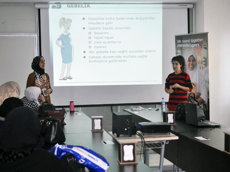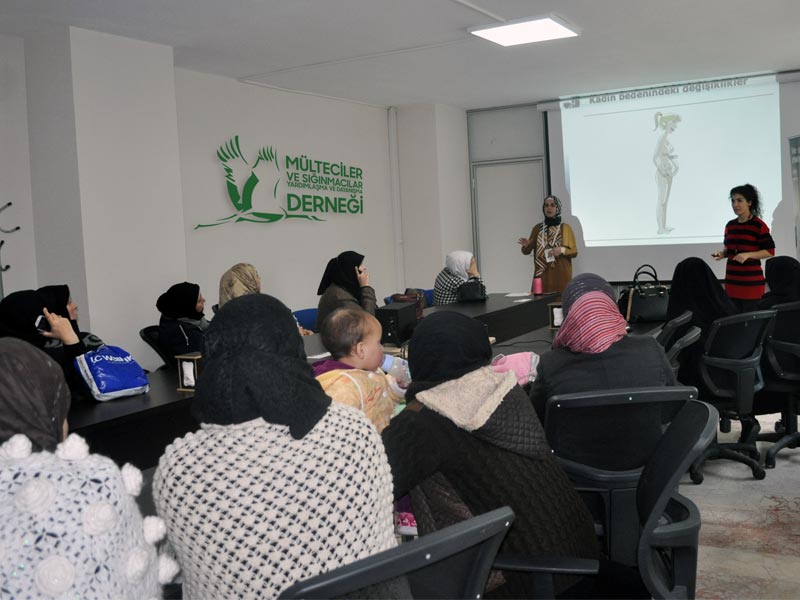 والتغيرات النفسية المرافقة للحمل والفحوصات الطبية التي يجب إجرائتها وما يتعلق بتخطي الخطورة من ناحية العلاقة أثناء الحمل كما تطقرأنا إلى أنواع الولادة والأمومة والنفاث والعناية بالمرأة النفثاء وفحوصات النفاث الدورية وإرضاع الطفل وضرورة الإلتزام باللقاحات والصحة وفي إحدى فقرات الندوة قامت النساء المشاركات بالتحدث عن تجاربهن وكماتم الإجابة عن تساؤلاتهن وفي ختام الندوة تم توزيع مجموعة أدوات نظافة ومعدات تعقيمية من أجل العناية الشخصية وهذه الندوات مستمرة بشكل دوري بدعم من وقف تنظيم الأسرة في تركيا ومفوضية الأمم المتحدة