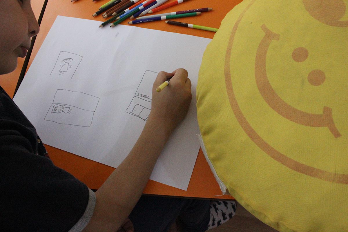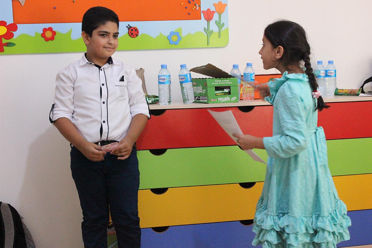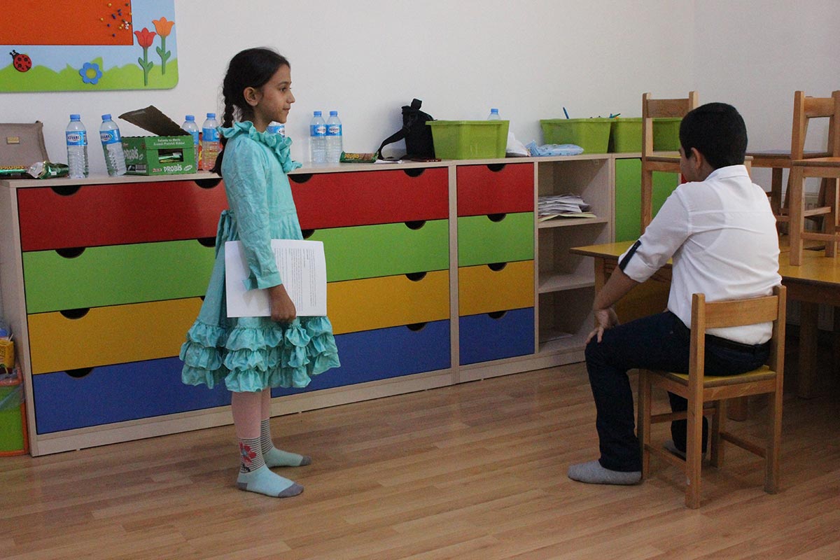 Children have met up in Drama workshop. At the beginning of the workshop participants played some children’s plays which had been structured to improve their harmony and empathy. Afterwards children tried to remember what they did from yesterday until arriving this workshop space. They also tried to feel what they smelled, tested and heared. Finally they told their memories, which are so important for them, each other in groups of two. Each group member visualized the memory of her/his peer as painting. Afterwards, each participant tried to find her or his memory. Facilitative questions which were followed up in the workshop are “What do you feel that another person visualized your memory?”, “How many look like your memory and the painting on the wall?”, “How much our peer whom we told our memory understood us?” Participants have also tried forum theater technique, which had been developed by Augusto Boal, in role-playing. They’ve tried to strengthen the position of Oppressed in oppressed-oppressor conflict.