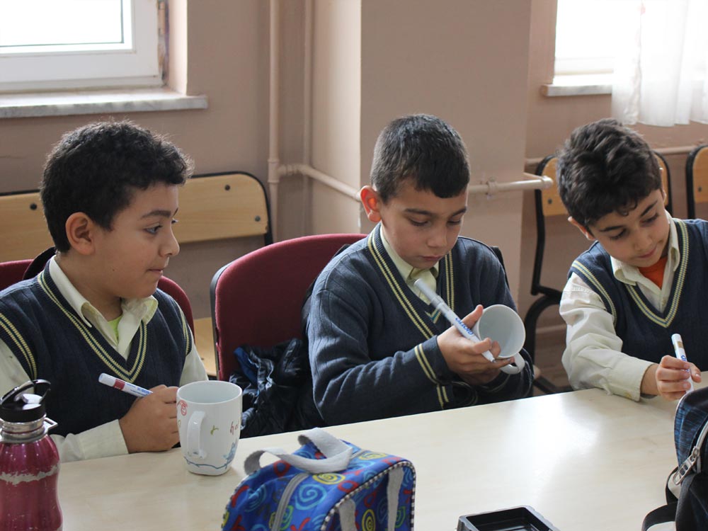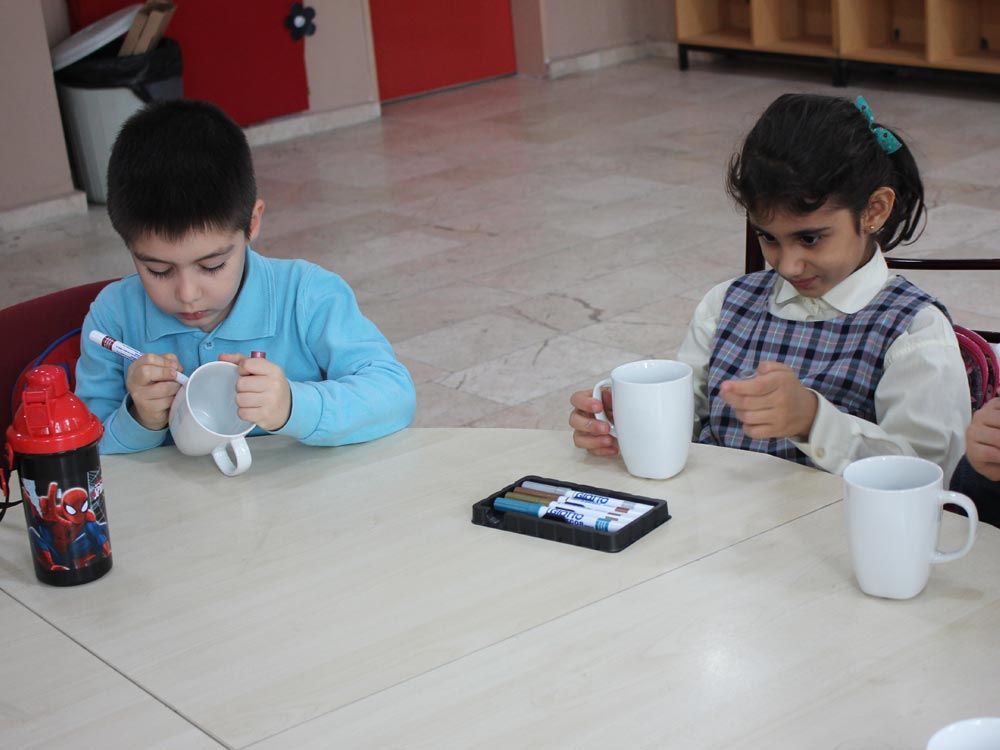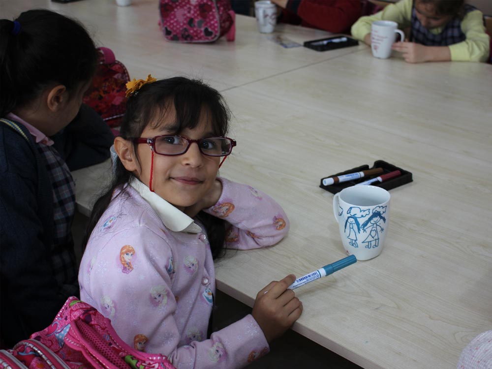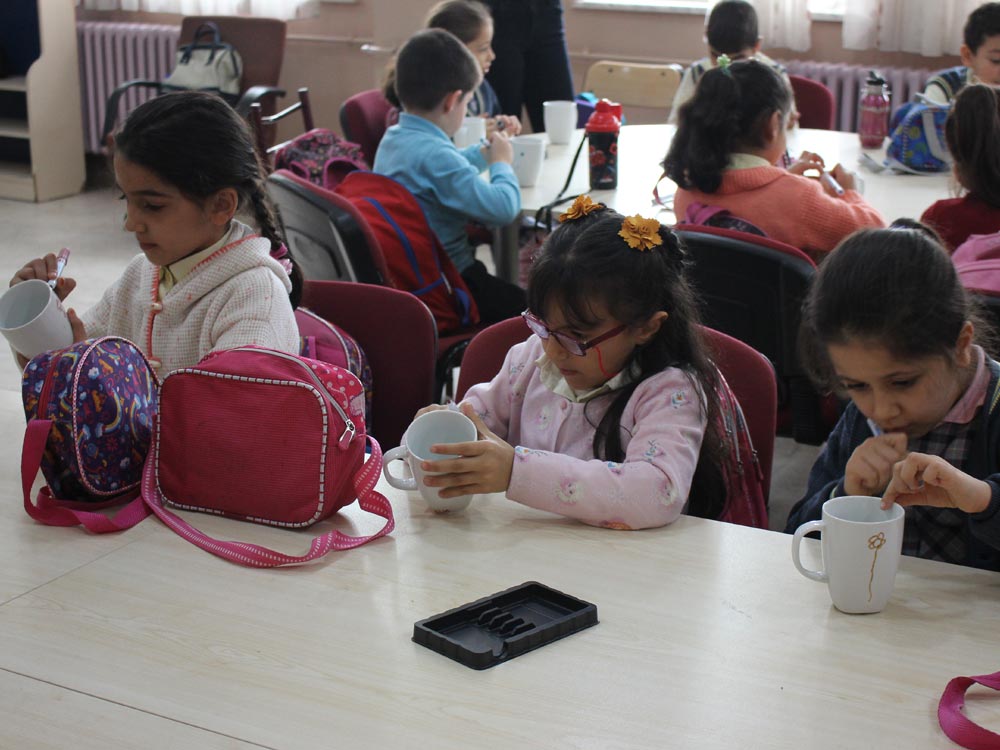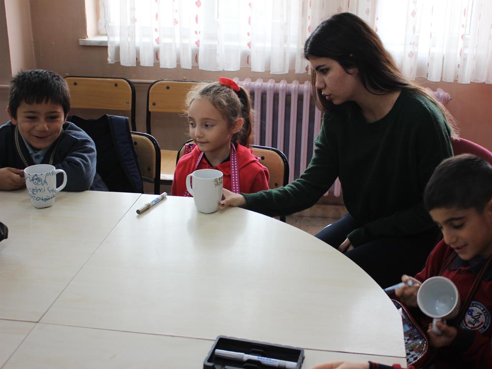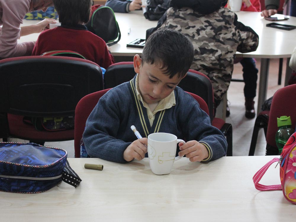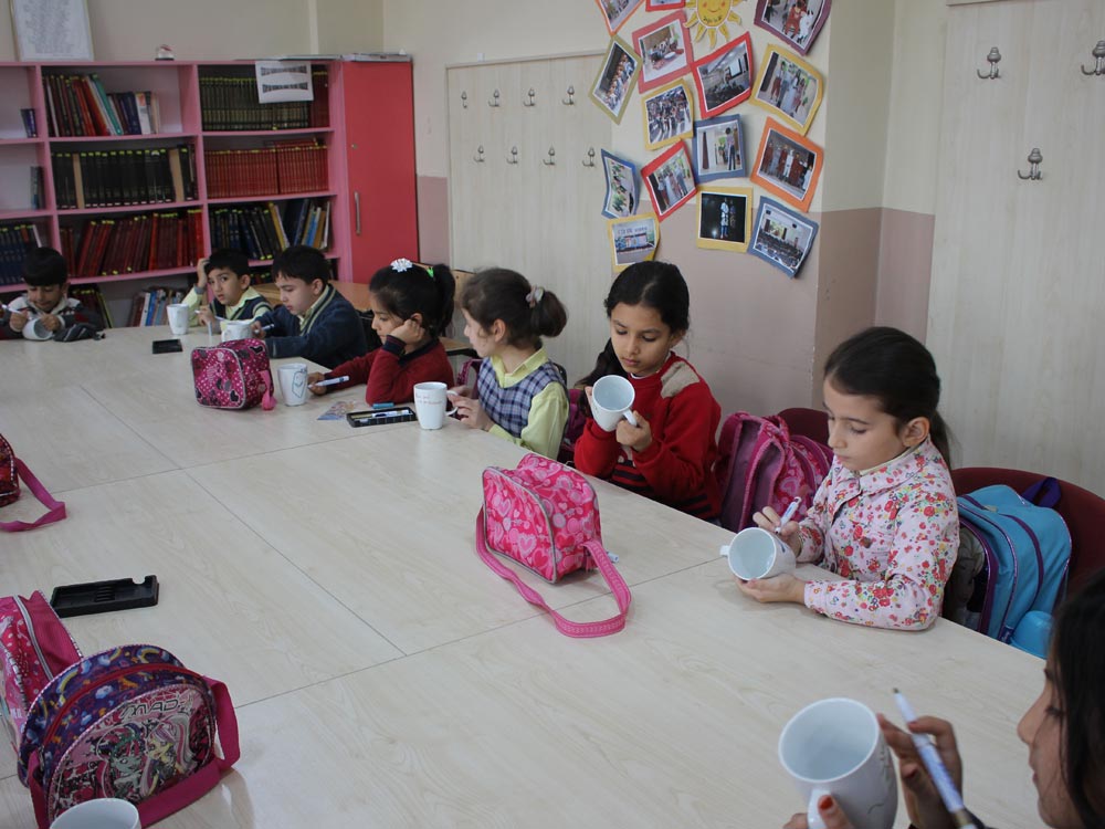 Turkish and Syrian children who came together in an Art Workshop this week designed cups for the teachers day. Different works of children emerged at the end of the event; each work filled with creativity and decorated in colorful original shapes. Children left the event happy knowing that they will be presenting their own designs as gifts to their teachers.