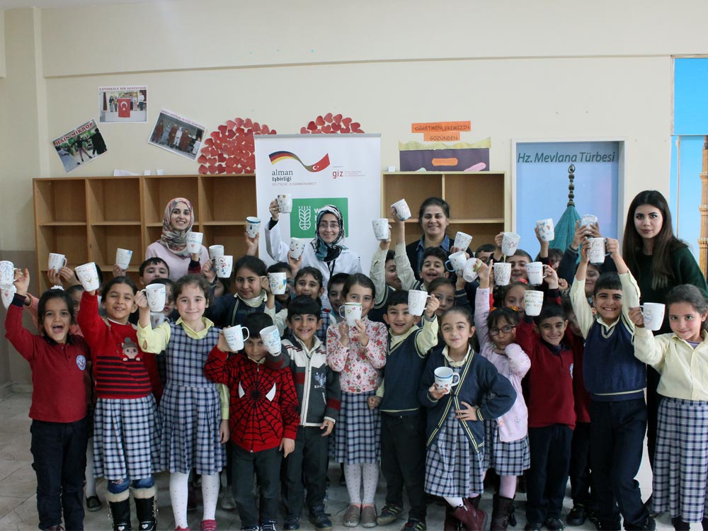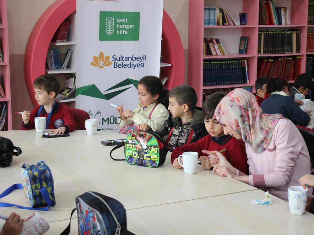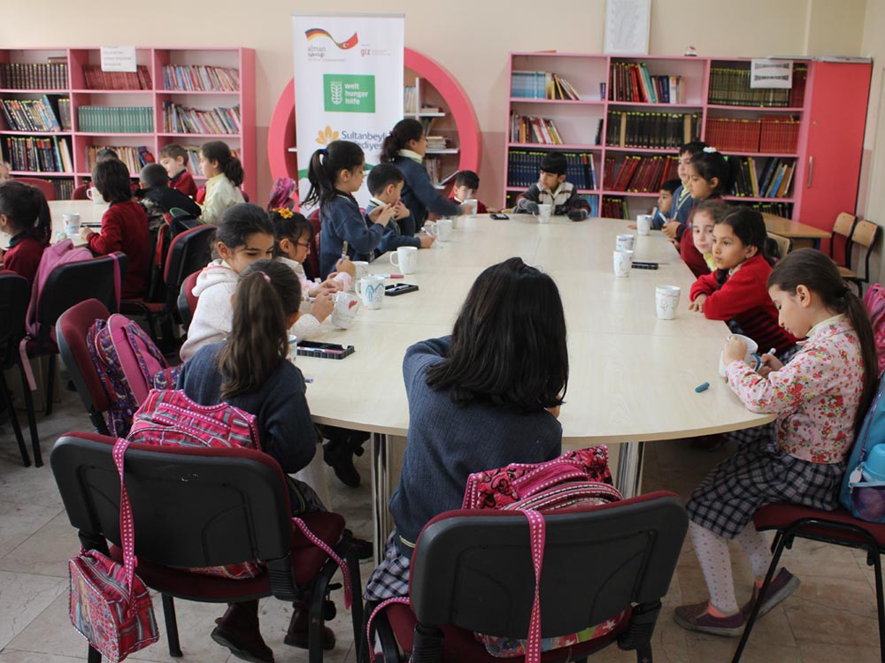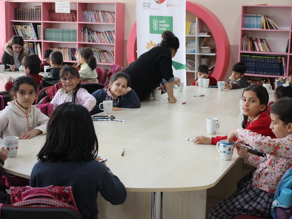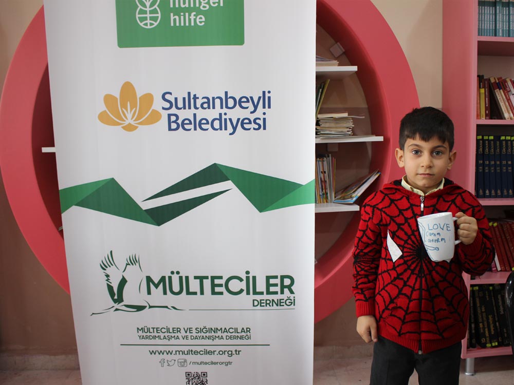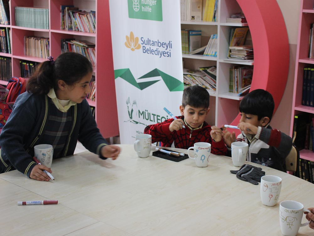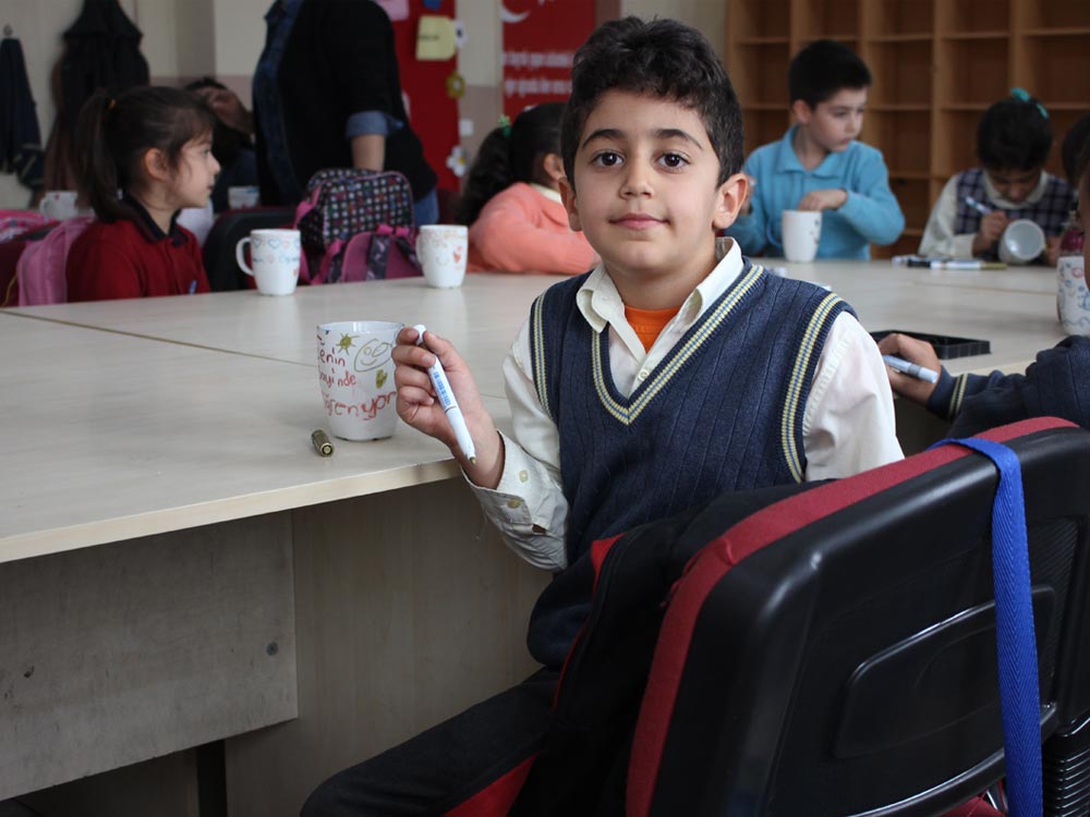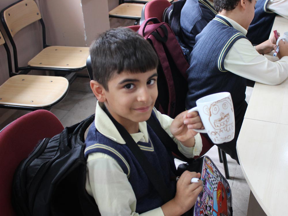 Turkish and Syrian children who came together in an Art Workshop this week designed cups for the teachers day. Different works of children emerged at the end of the event; each work filled with creativity and decorated in colorful original shapes. Children left the event happy knowing that they will be presenting their own designs as gifts to their teachers.