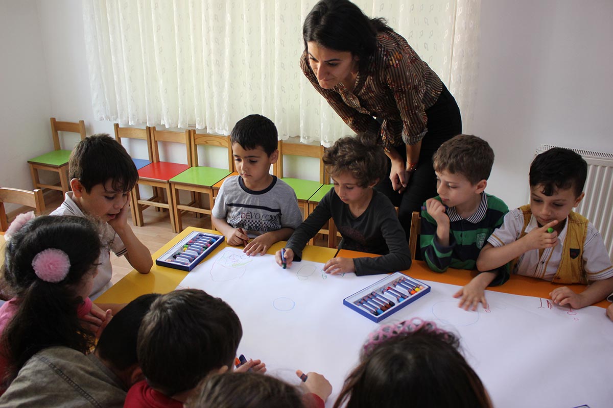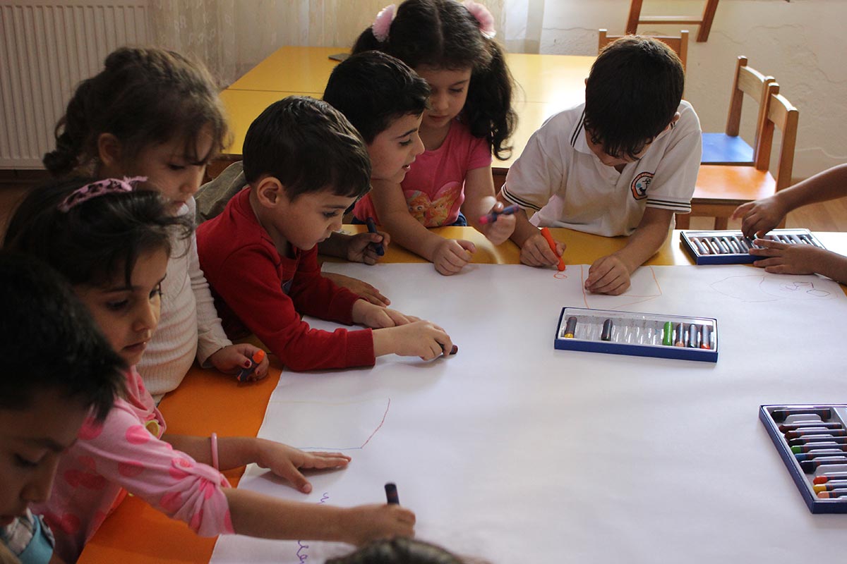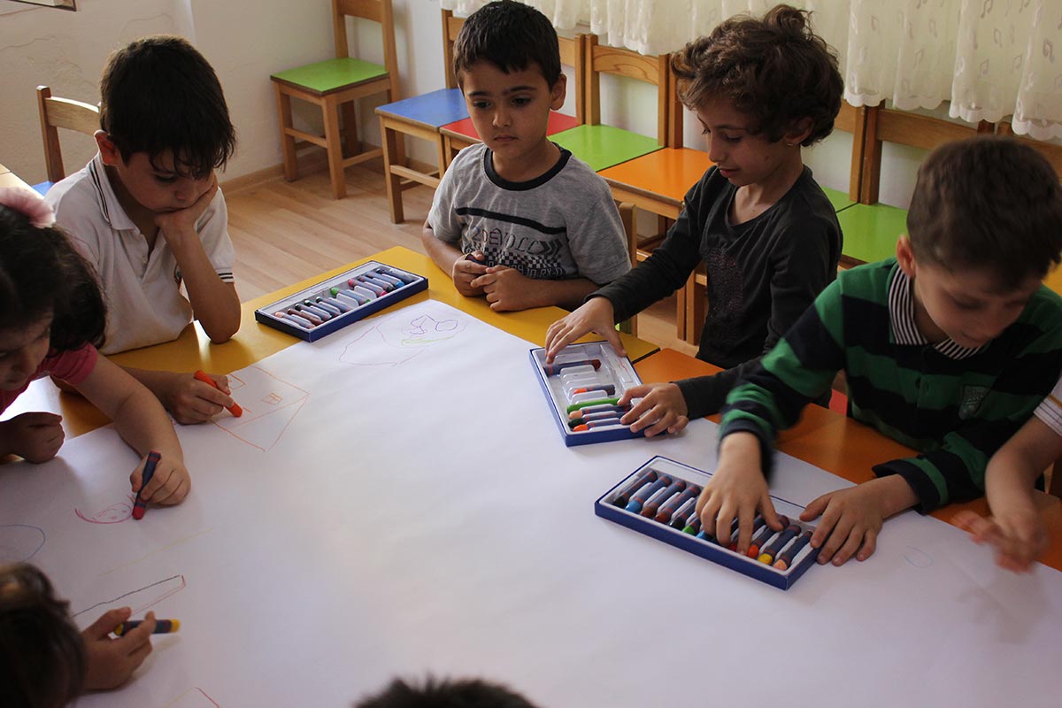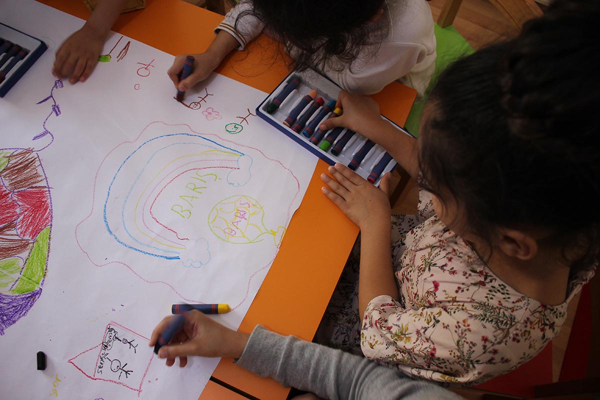 After the conversation with the children who came together, what peace meant for them, they made pictures on peace in the free workshop.