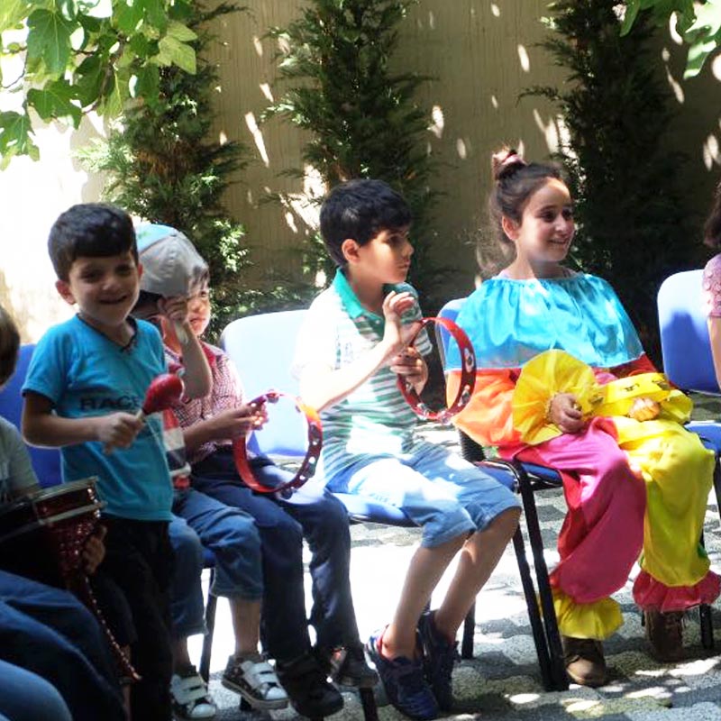 The second Rhythm Workshop was held with the participation of 36 Turkish and Syrian children, between the ages of 7 and 14. This gathering was made possible with the cooperation of the Refugees Association, Blue Crescent Foundation and Nursery Association / Flying Library. The children who came to the workshop introduced themselves to each other, while sitting on chairs, under the trees in the garden of the Refugee Association Preschool.